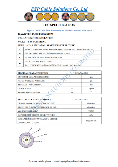 ESP Cable Solutions Co.,Limited supply bulk quantity of Tubing Encapsulated Cables and Control Line Tubing to the market per month, ESPCS Tubing Encapsulated Cables and Control Line Tubing are very popular in the worldwide. The main types of Tubing Encapsulated Cables have 10000/15000/20000 PSI Tubing Encapsulated Cables, Round/Square shape Tubing Encapsulated Cables, 150℃/175℃/200℃/250℃/300℃ Tubing Encapsulated Cables, 1/3/4/5/10/24 Cores Tubing Encapsulated Cables, 28AWG-8AWG conductor size Tubing Encapsulated Cables, Bare/Tinned/Silver Plated/Nickel Plated copper conductor Tubing Encapsulated Cables, ETFE/FEP/PFA/PTFE Insulated Tubing Encapsulated Cables, ETFE/FEP/HDPE/PFA/PP/PVDF Encapsulated TEC Cables, 316L/Duplex2205/Alloy400/Alloy 625/Alloy825 Tubing Encapsulated Cables, 1/8”/1/4”/4mm OD Tubing Encapsulated Cables, Downhole Temperature Measuring Cables, Downhole Tubing Encapsulated Cables, Tubing Encapsulated Downhole Cables, Downhole Fiber Optic Cables, Downhole Conductor Cables, Fiber Optic Downhole Sensor Cables, Flat Pipe Armor Signal Cables, MC Sensor Cables, Encapsulated Communication Cables etc.