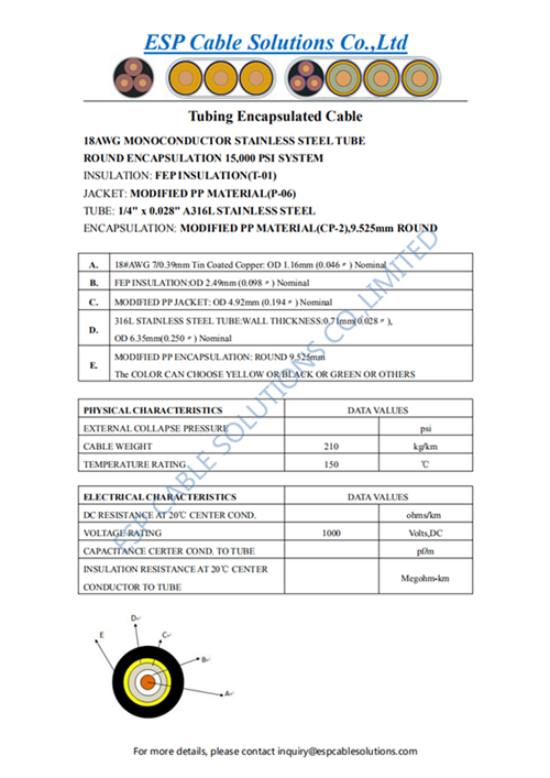 ESP Cable Solutions Co.,Limited supply bulk quantity of Tubing Encapsulated Cables and Control Line Tubing to the market per month, ESPCS Tubing Encapsulated Cables and Control Line Tubing are very popular in the worldwide. The main types of Tubing Encapsulated Cables have 10000/15000/20000 PSI Tubing Encapsulated Cables, Round/Square shape Tubing Encapsulated Cables, 150℃/175℃/200℃/250℃/300℃ Tubing Encapsulated Cables, 1/3/4/5/10/24 Cores Tubing Encapsulated Cables, 28AWG-8AWG conductor size Tubing Encapsulated Cables, Bare/Tinned/Silver Plated/Nickel Plated copper conductor Tubing Encapsulated Cables, ETFE/FEP/PFA/PTFE Insulated Tubing Encapsulated Cables, ETFE/FEP/HDPE/PFA/PP/PVDF Encapsulated TEC Cables, 316L/Duplex2205/Alloy400/Alloy 625/Alloy825 Tubing Encapsulated Cables, 1/8”/1/4”/4mm OD Tubing Encapsulated Cables, Downhole Temperature Measuring Cables, Downhole Tubing Encapsulated Cables, Tubing Encapsulated Downhole Cables, Downhole Fiber Optic Cables, Downhole Conductor Cables, Fiber Optic Downhole Sensor Cables, Flat Pipe Armor Signal Cables, MC Sensor Cables, Encapsulated Communication Cables etc.