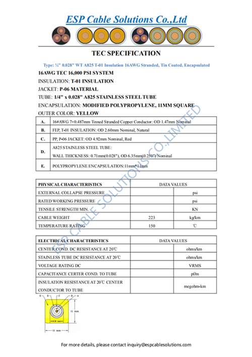 - Product Name:TEC CABLE 1/4" 0.028"WT A825 T-01 INSULATION 16AWG STRANDED,TINNED,ENCAPSULATED