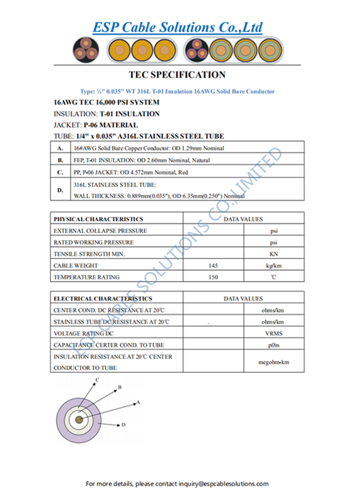 - Product Name:TEC CABLE 1/4" 0.035"WT 316L T-01 INSULATION 16AWG SOLID BARE CONDUCTOR