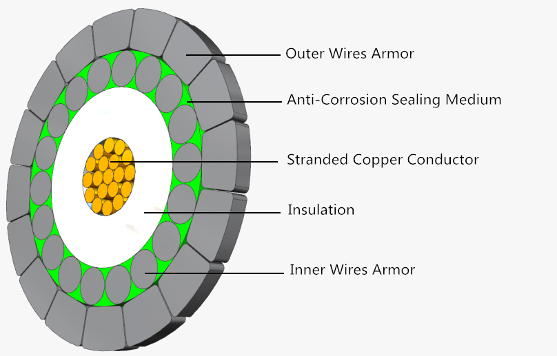 (4)The anti-corrosion sealing medium is coated between the inner and outer armor layers, which can reduce liquid corrosives from entering the inside of the cable, prevent the inside of the cable from being corroded, ensure the tensile strength of the cable, increase the service life of the cable, and effectively prevent underground oil overflow to the well surface, it forms a better protection for the environment.