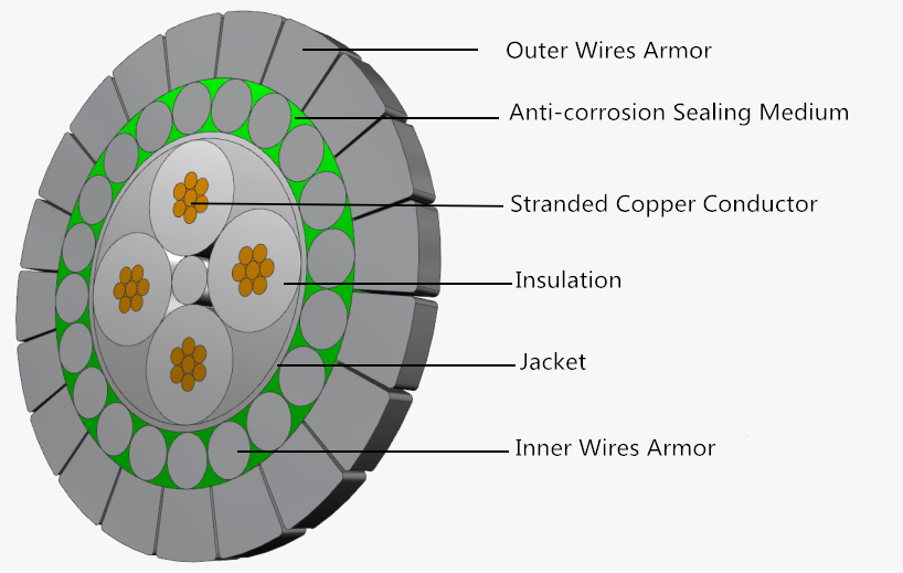 (4)The anti-corrosion sealing medium is coated between the inner and outer armor layers, which can reduce liquid corrosives from entering the inside of the cable, prevent the inside of the cable from being corroded, ensure the tensile strength of the cable, increase the service life of the cable, and effectively prevent underground oil overflow to the well surface, it forms a better protection for the environment.